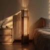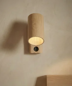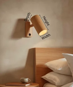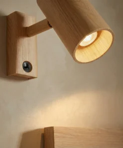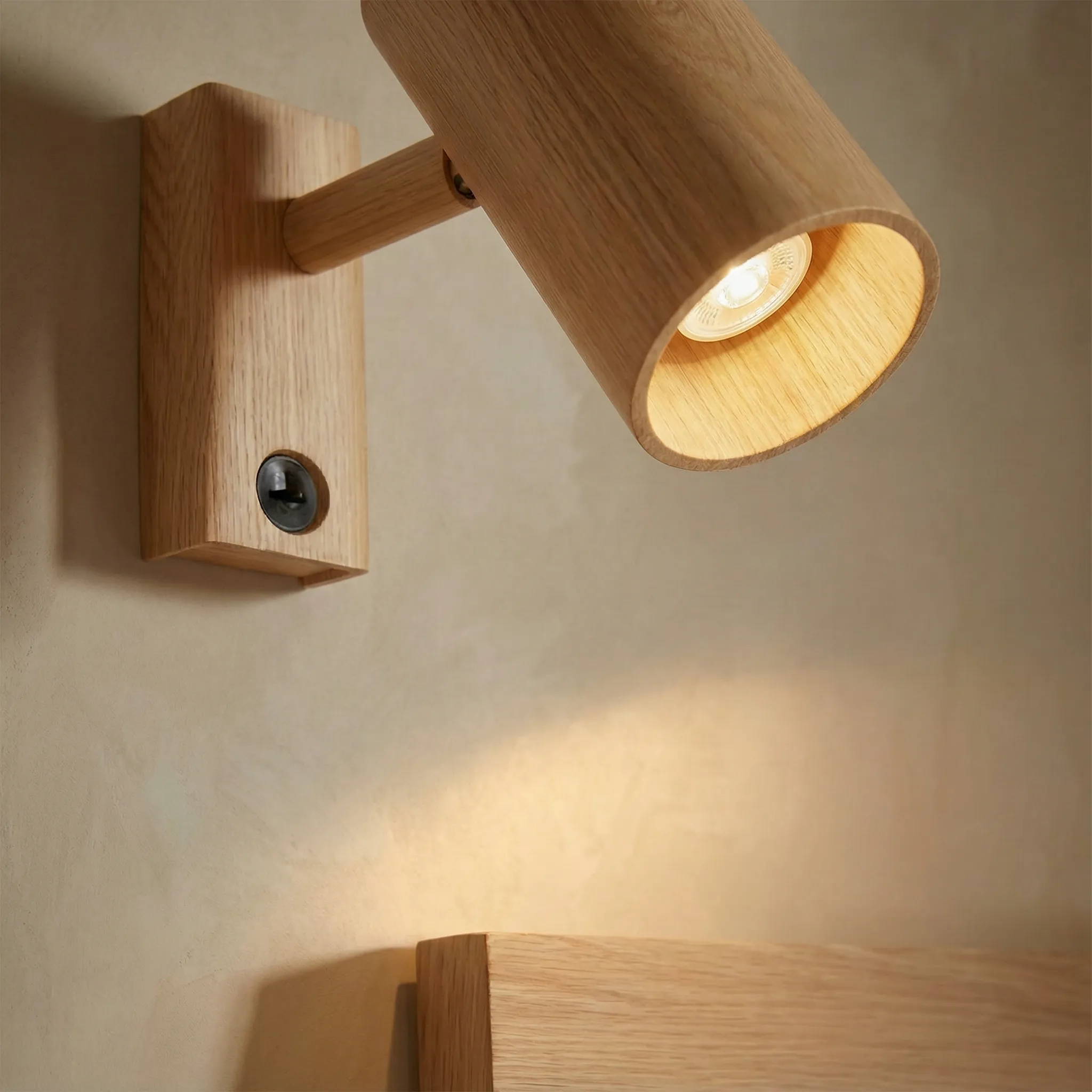 This wooden wall spotlight features a cylindrical shade mounted on a solid wood base, allowing the light to be angled for targeted illumination. The natural wood grain adds warmth and texture, while the soft interior glow creates a comfortable, inviting atmosphere.