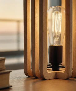 This modern wooden table lamp features a distinctive layered frame that surrounds the light source while keeping the design visually open. The repeated wooden contours add depth and rhythm, allowing light to glow gently through the structure without glare.