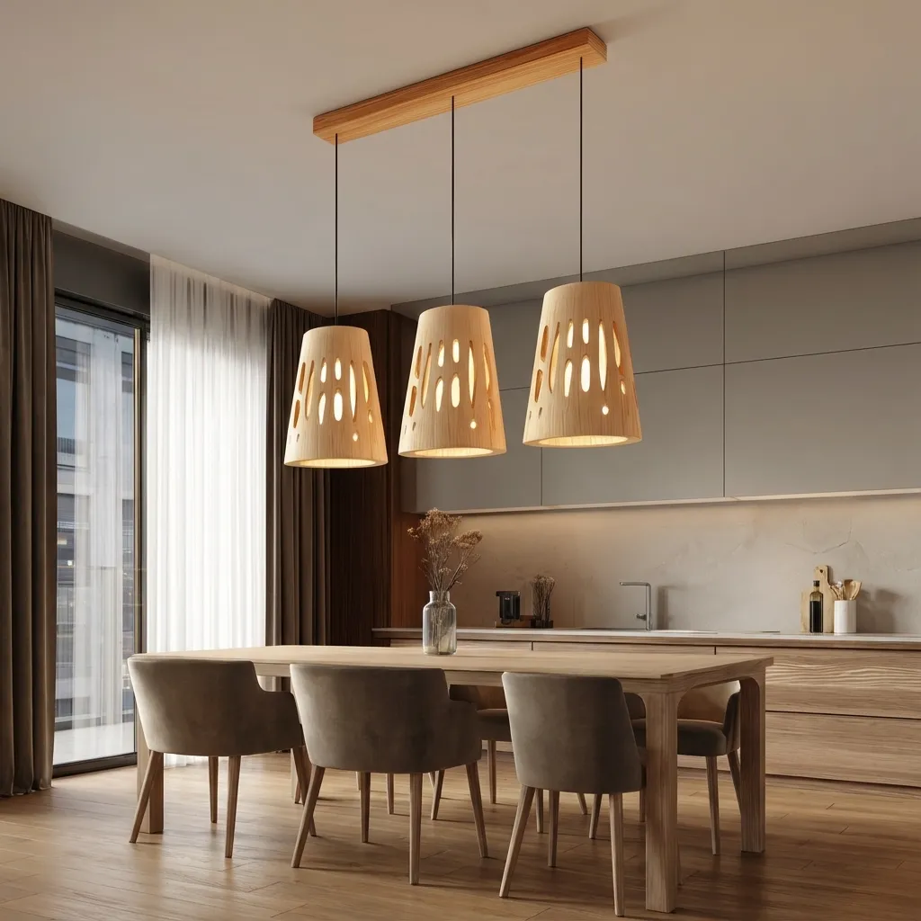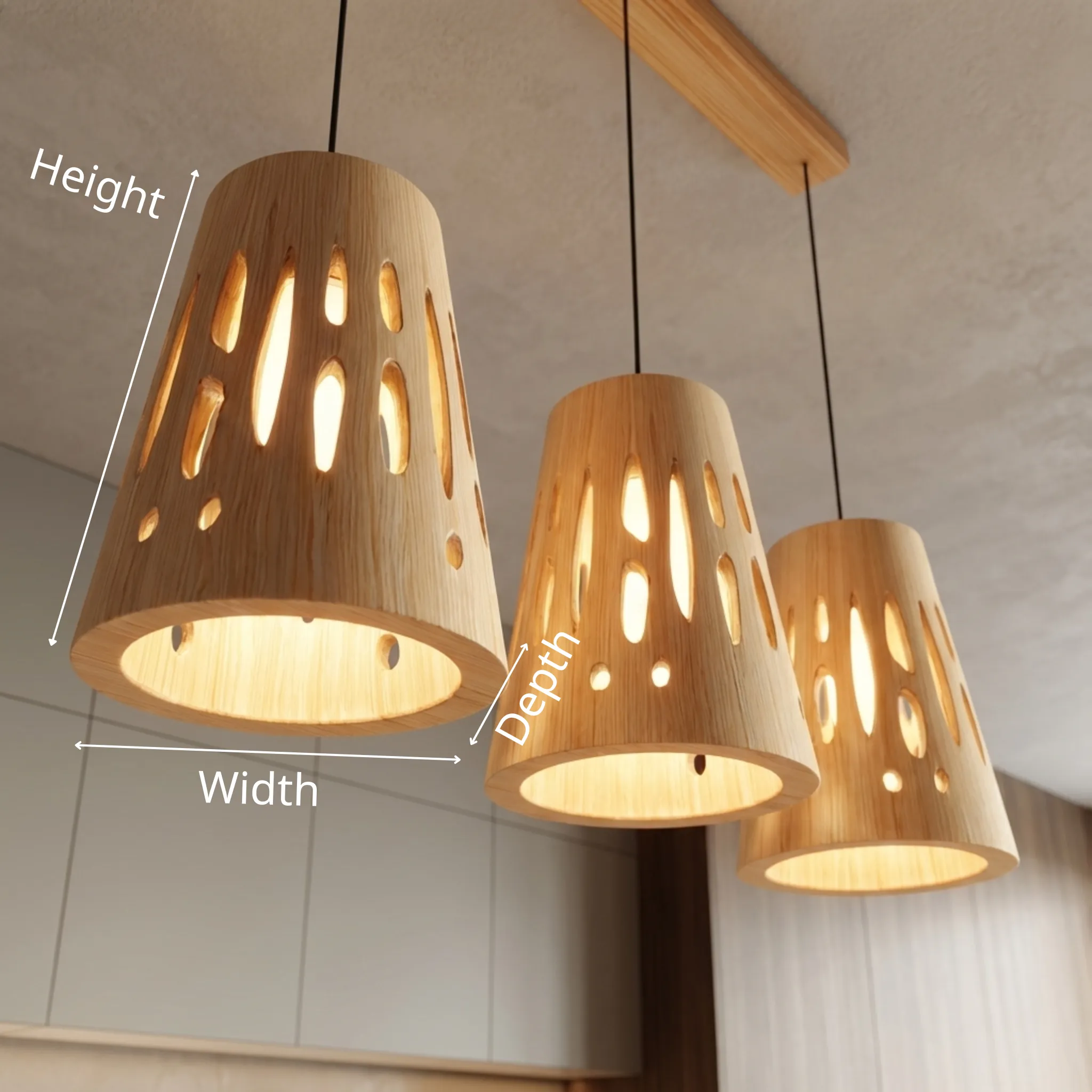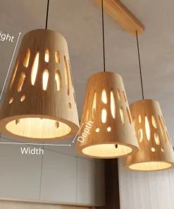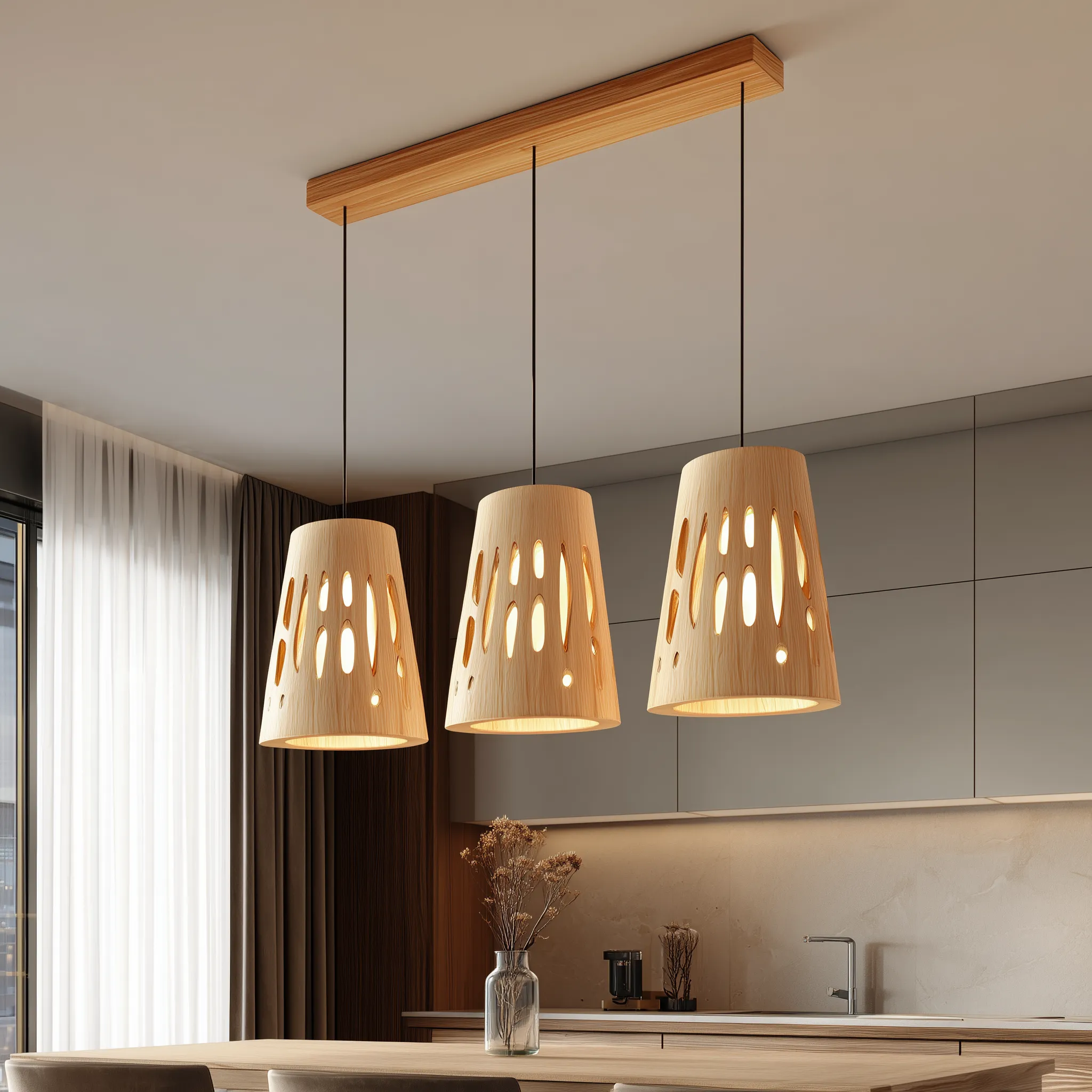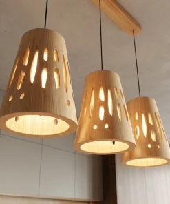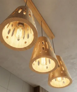 This pendant light set showcases three matching wooden shades suspended from a slim ceiling bar, each shaped with organic cut-out openings that allow light to glow through gently. The natural wood surface and rounded forms create a balanced look that feels both decorative and calm, while the perforations add visual interest without feeling heavy.