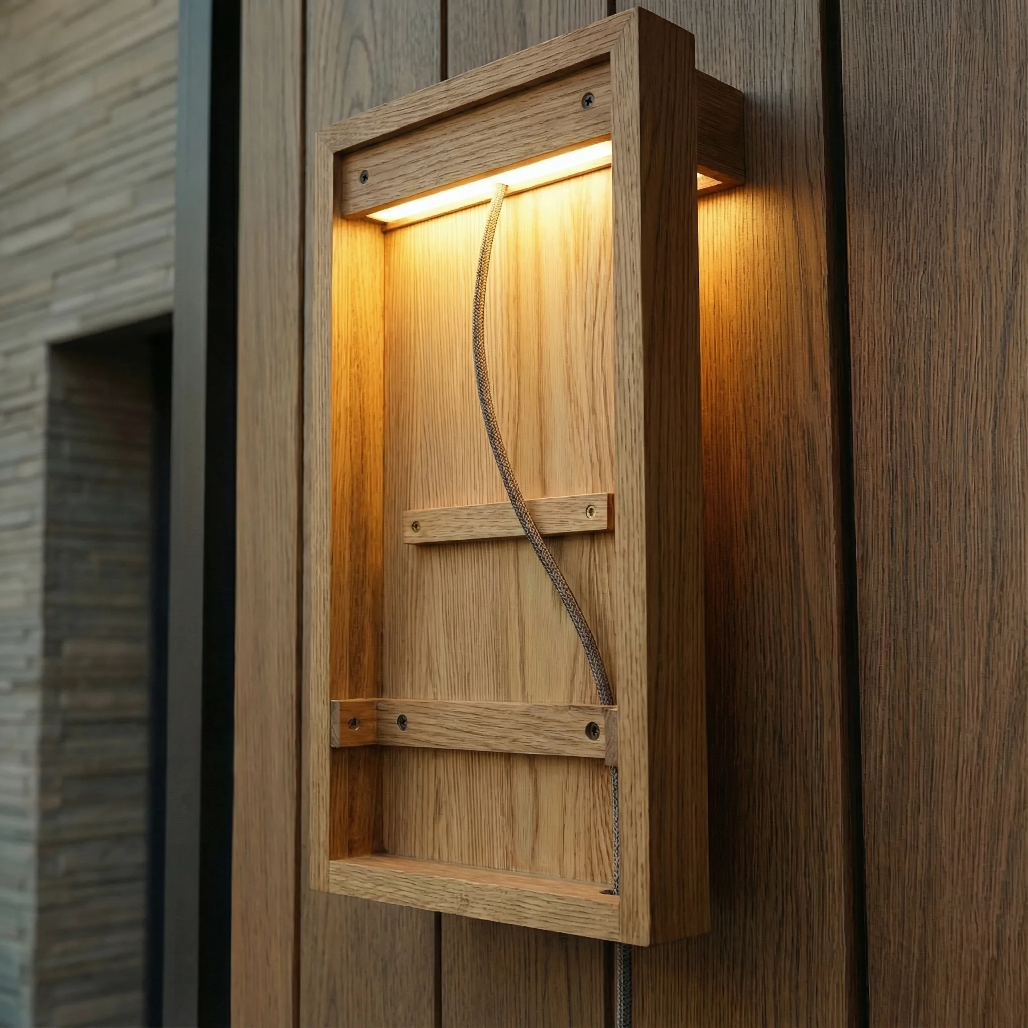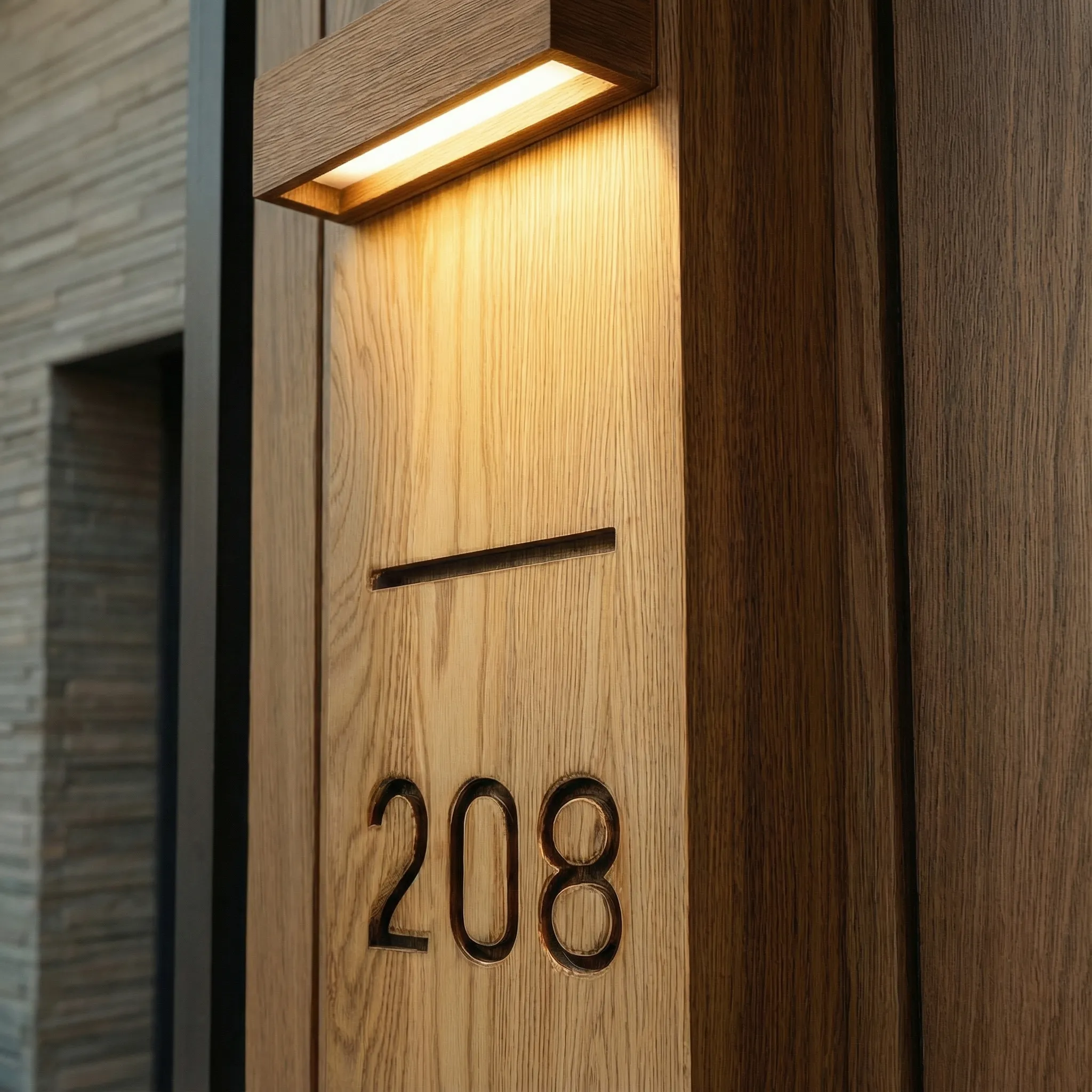 Ideal for modern entrances and exterior walls, the design blends natural wood grain with clean geometry. It adds both function and character to the façade, creating a welcoming and well-defined entry point after dark.