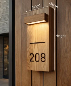 This wall light is crafted from solid wood and designed to highlight house numbers with a soft, downward glow. The integrated light source gently illuminates the engraved address, ensuring visibility while maintaining a refined and understated appearance.