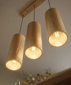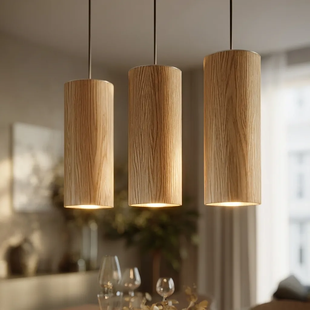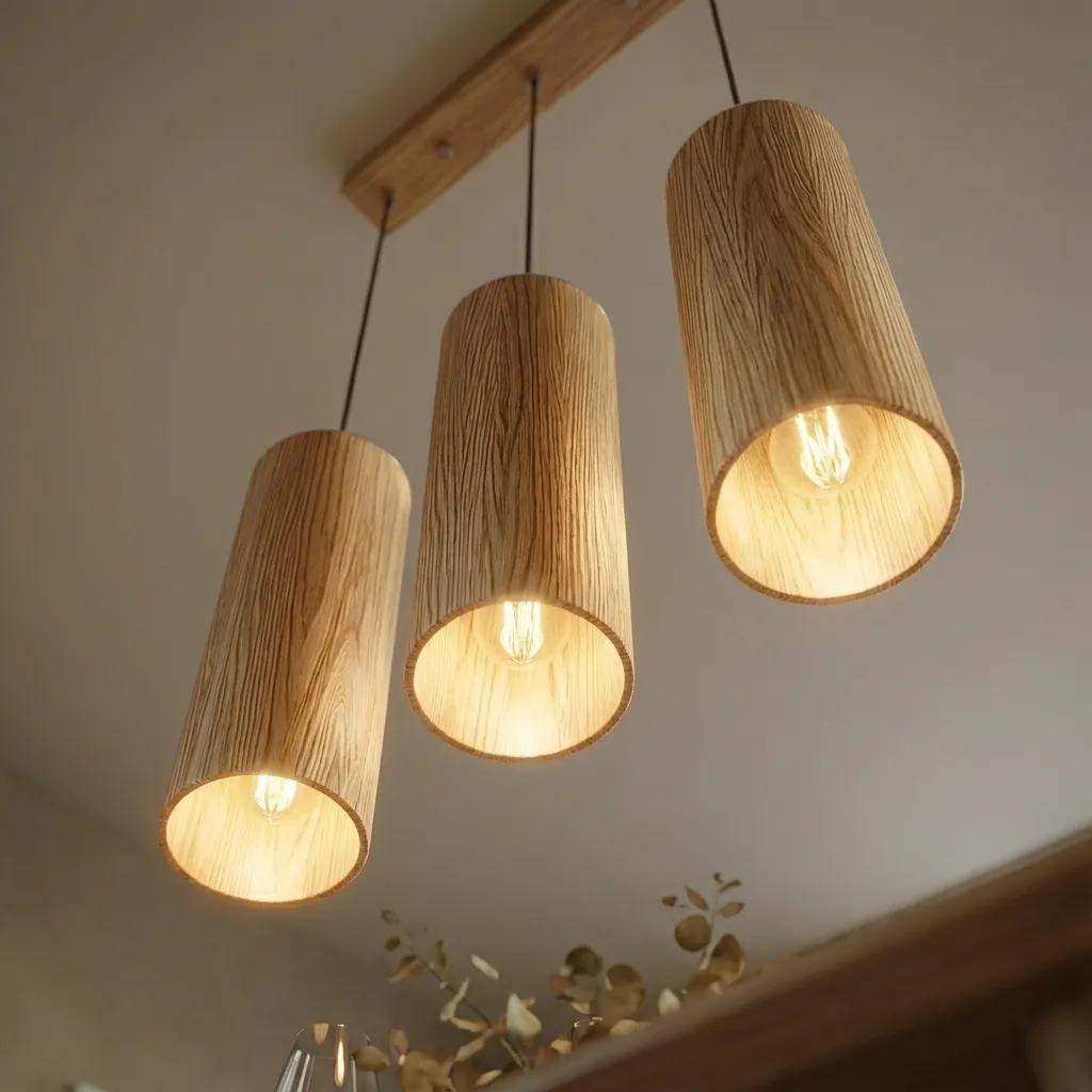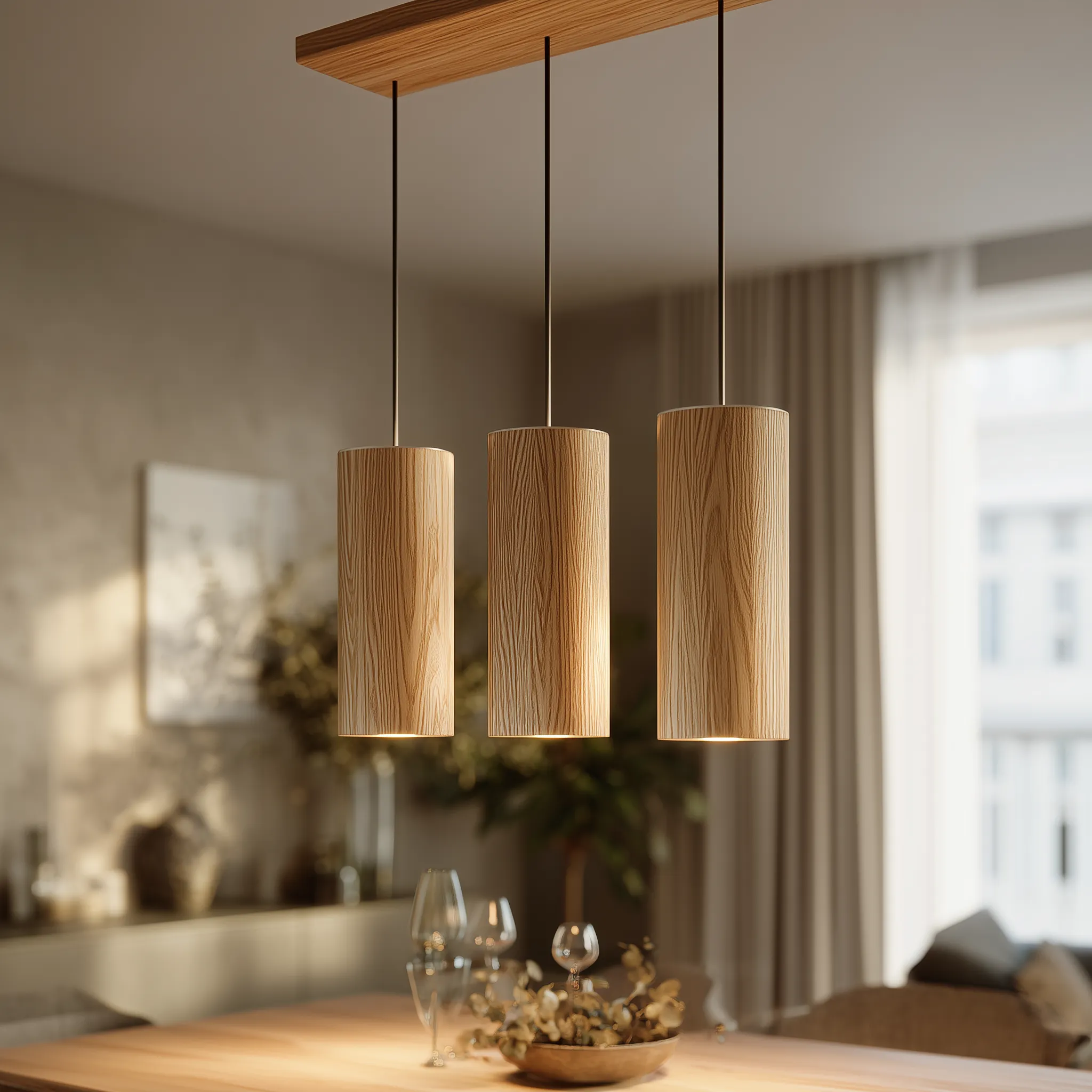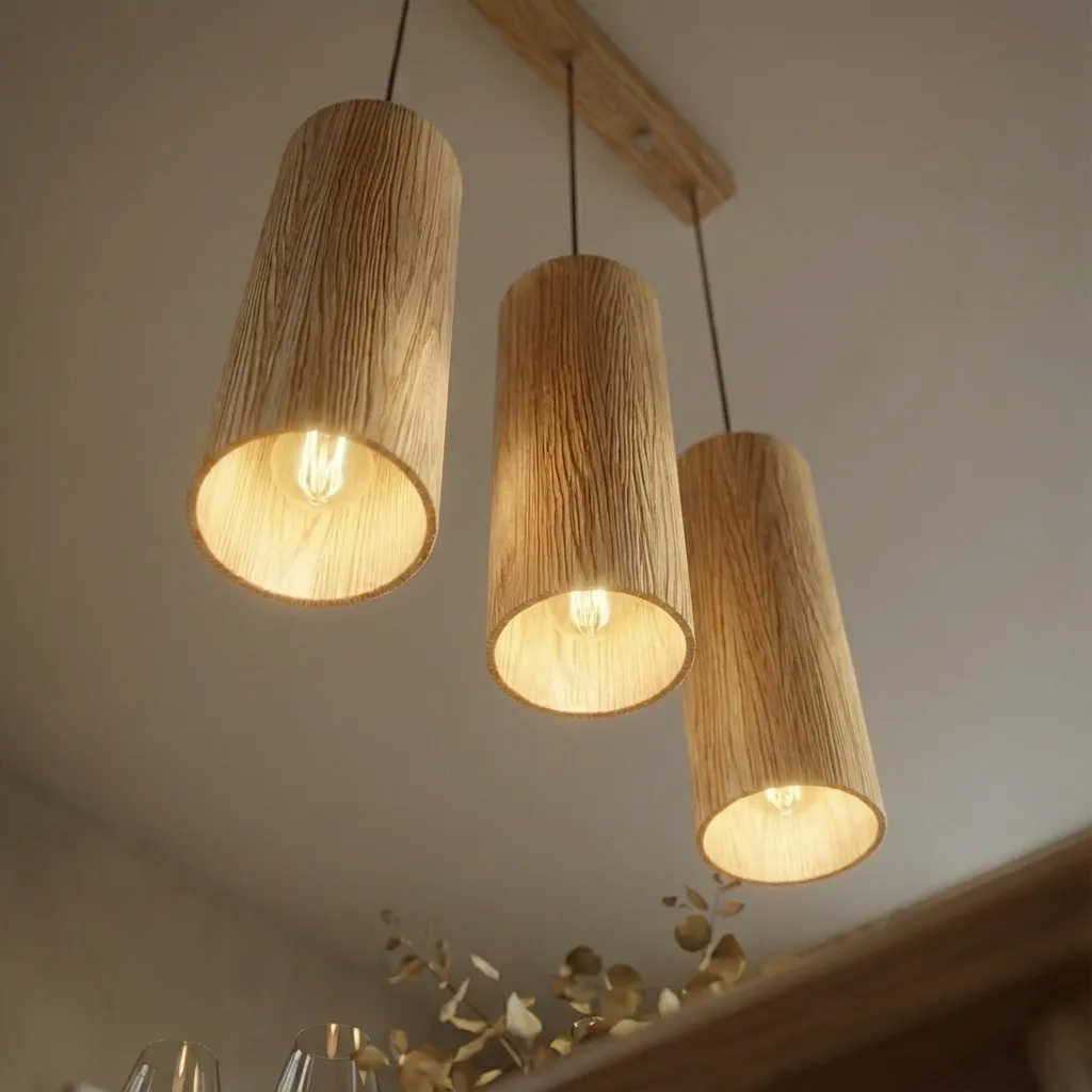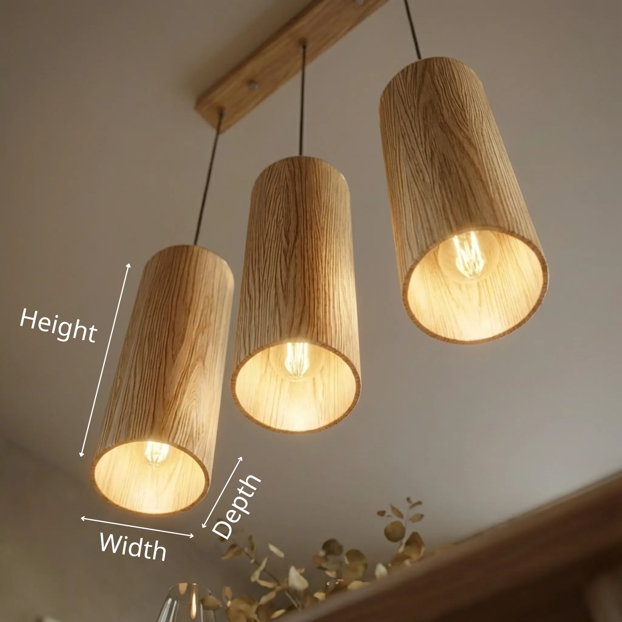 This triple pendant light features three cylindrical solid wood shades suspended from a matching wooden canopy, creating a balanced and symmetrical composition. Each pendant casts a soft, downward glow that highlights the natural wood grain while providing comfortable task lighting for dining and gathering areas.