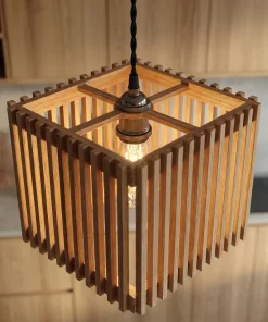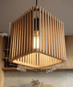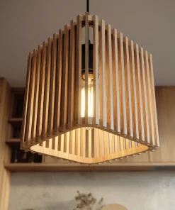 This pendant light features a structured square form built from evenly spaced wooden slats, allowing light to pass through and create soft patterns across surrounding surfaces. The open-frame design highlights the natural wood grain while keeping the overall look light and visually balanced.