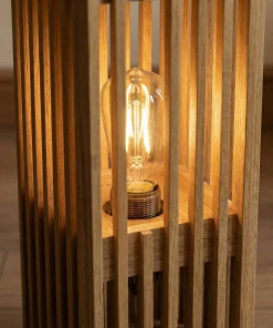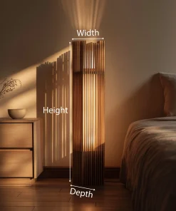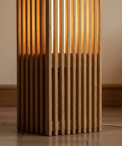 This floor lamp features a vertical slatted wood structure that gently filters light, creating soft shadows and a relaxing glow across the room. The natural wood tone adds depth and warmth, making it a subtle focal point without overwhelming the space.