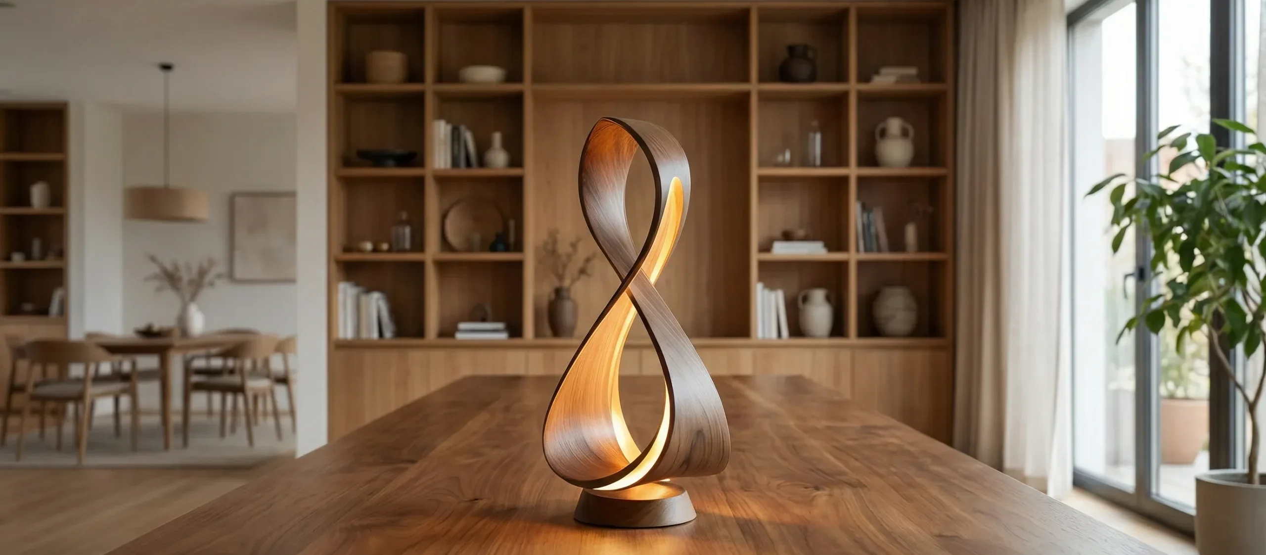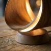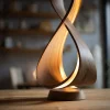 A refined wooden table lamp featuring an infinity-inspired form that emits a soft, ambient glow.