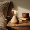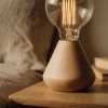 A compact wooden bedside lamp featuring a smooth sculpted base and an exposed bulb, designed to create soft, atmospheric lighting in calm interior spaces.