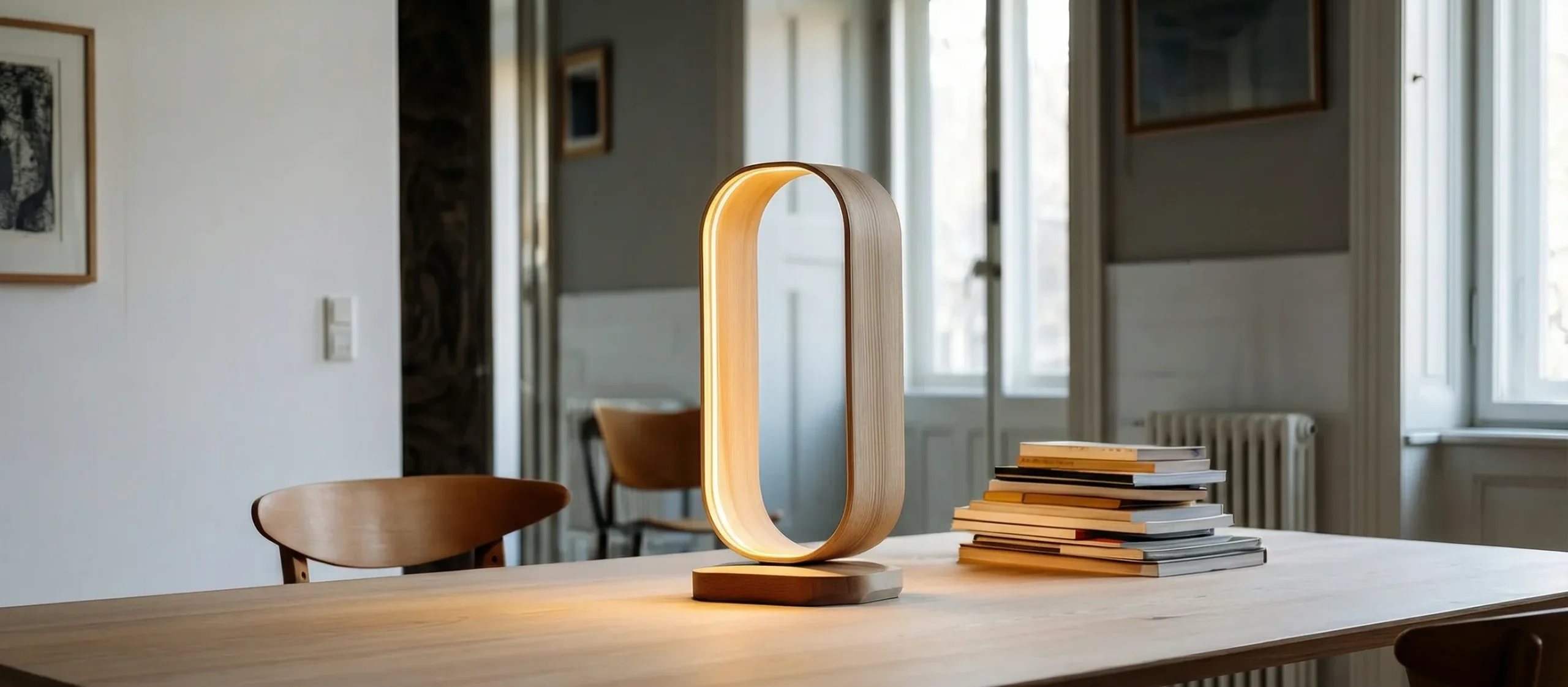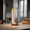 This table lamp is defined by its seamless loop-shaped wooden frame, with integrated lighting that runs along the inner edge to create a gentle, even glow. The vertical oval silhouette feels light and balanced, acting as both a functional light source and a decorative object.