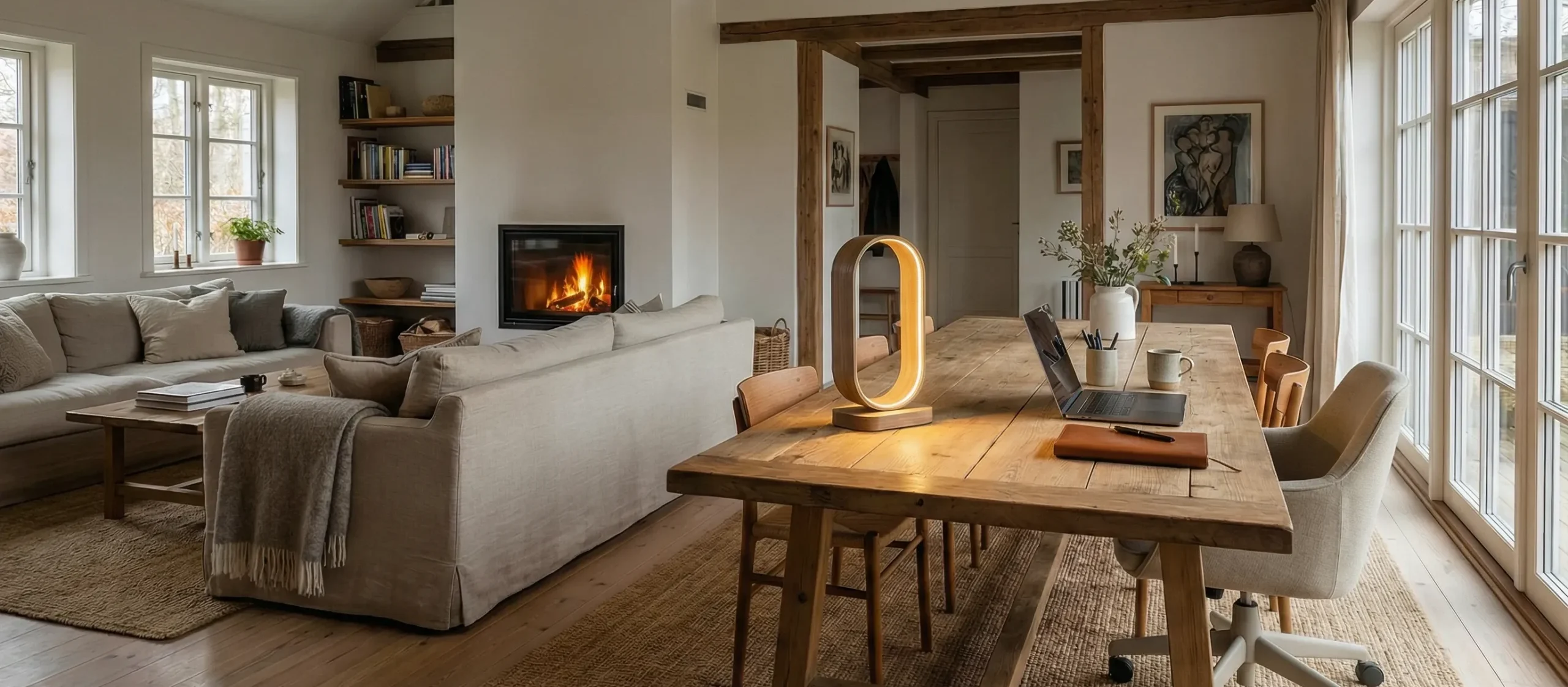 A sculptural wooden table lamp with a continuous loop form, offering soft ambient light and a calm, modern presence.