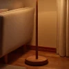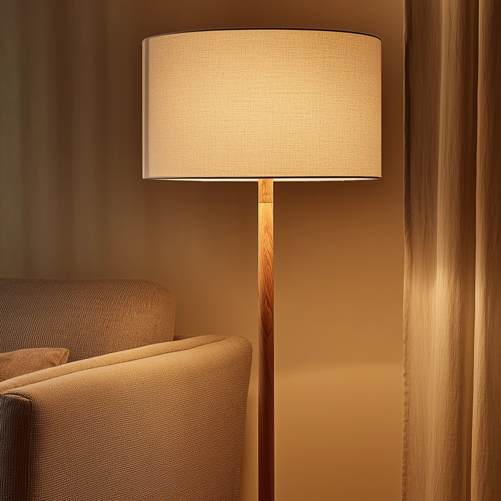This floor lamp features a slim wooden pole and a drum fabric shade that provides soft, ambient lighting. Its simple, upright form fits neatly beside sofas or along walls.