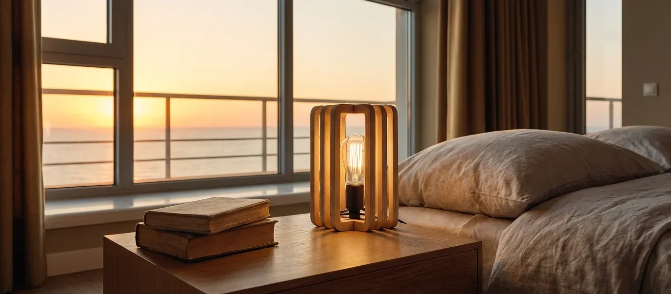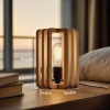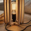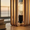 This modern wooden table lamp features a distinctive layered frame that surrounds the light source while keeping the design visually open. The repeated wooden contours add depth and rhythm, allowing light to glow gently through the structure without glare.