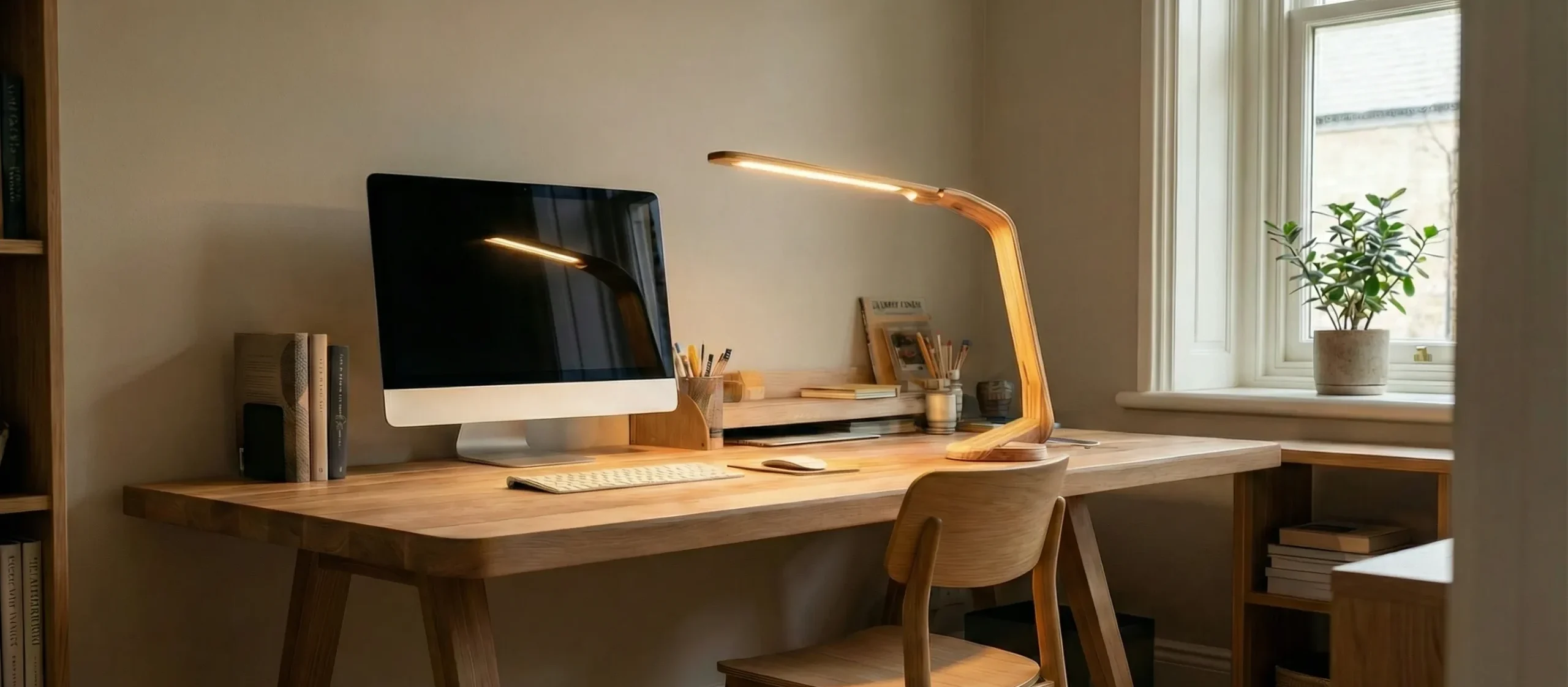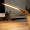 A refined wooden desk lamp with a gently curved silhouette and integrated LED lighting for focused, comfortable illumination.